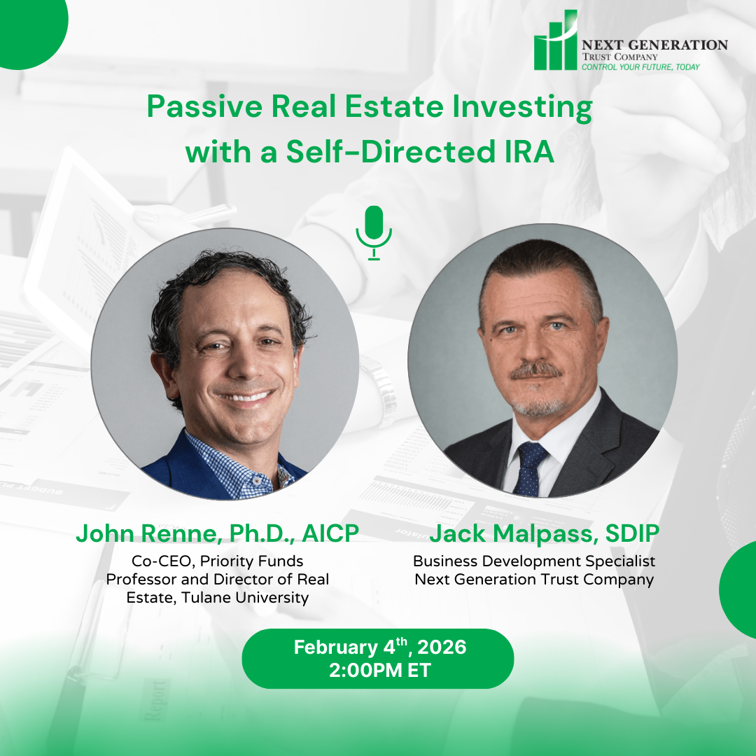 Join Priority Funds and Next Generation Services for a live educational webinar exploring how self-directed IRAs (SDIRAs) can be used for passive commercial real estate investing. This session will cover the fundamentals of SDIRAs, how to open and fund an account, and how alternative assets like institutional-quality real estate may support diversification in today’s evolving investment landscape.